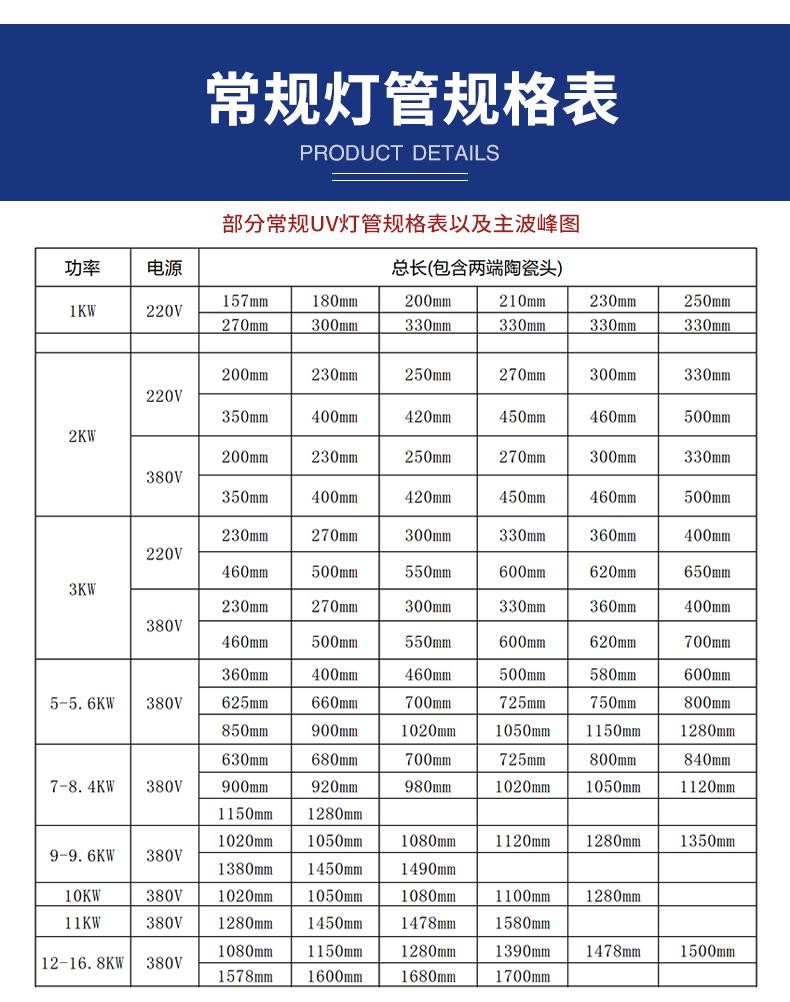 | uv固化燈 | 1kw | 165 | 190 | 210 | 230 | 270 | 300 | 330 | 360 | 400 |